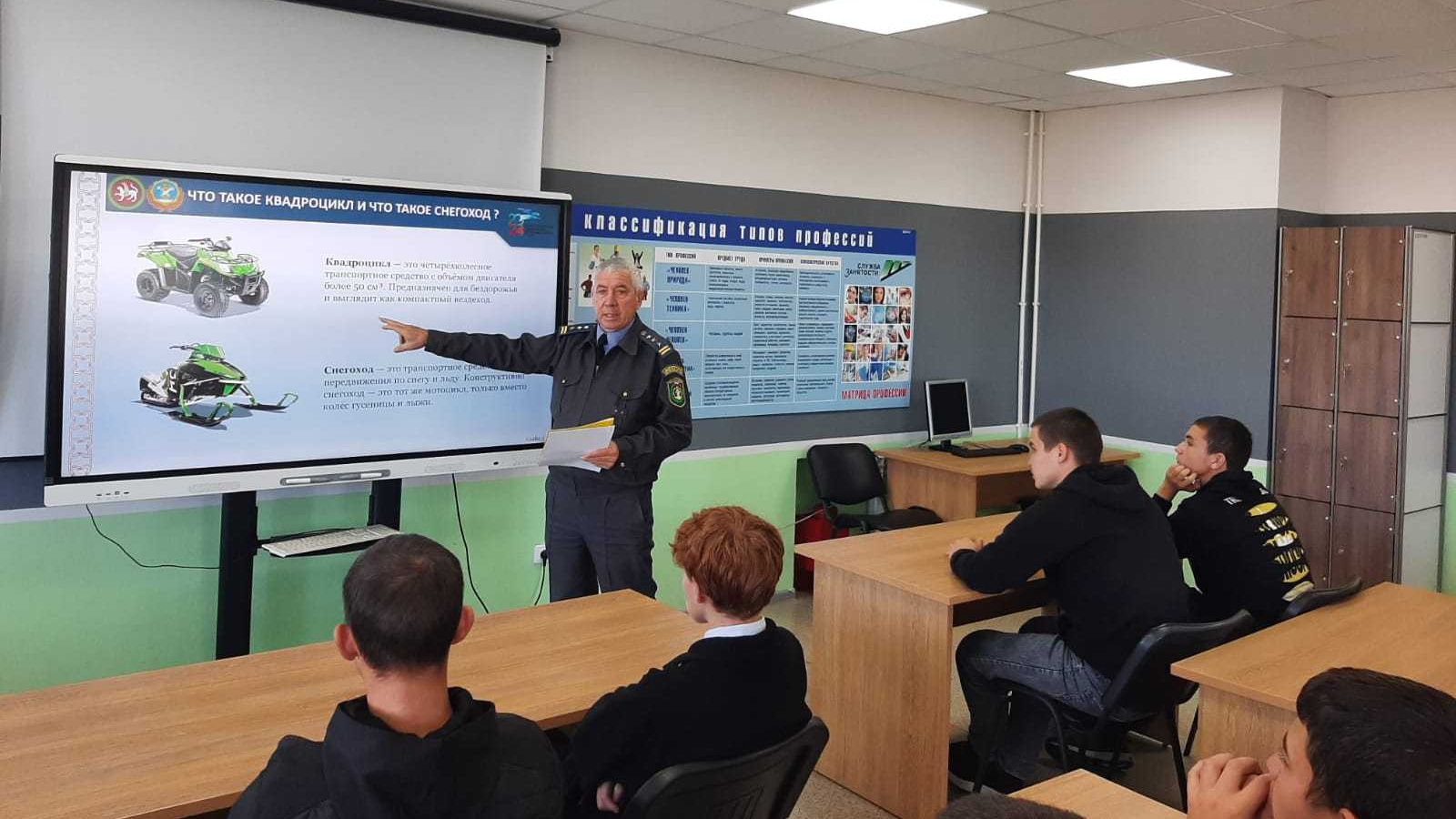 Во время занятия Р.И. Кирамов ознакомил студентов с порядком получения удостоверения на право управления квадроциклом и снегоходом. Урок был не только информативным, но и наглядным. Инспектор привел статистику происшествий по стране, связанных с использованием квадроциклов, что помогло ученикам осознать всю серьезность вопроса.