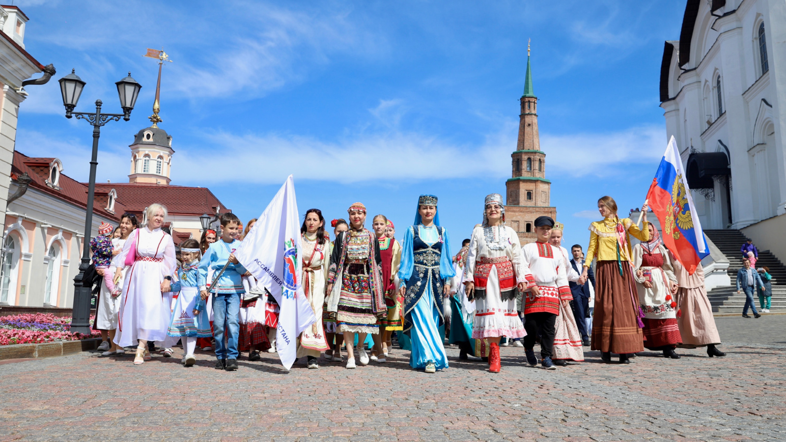 В Казанском Кремле в День России провели Парад дружбы народов, в котором поучаствовали представители более чем 30 национальностей. Они прошли с народными танцами и песнями от Башни Сююмбике до площади Первого мая.