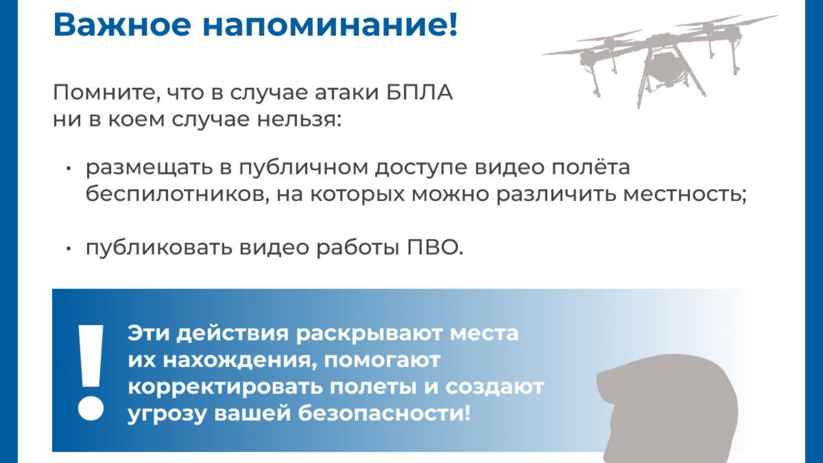 Важно! В случае атаки БПЛА не размещать в публичном доступе видео полёта беспилотников, на которых можно различить местность по любым ориентирам