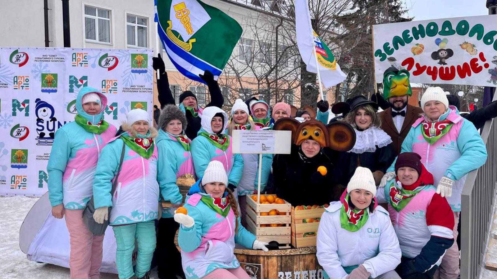 Зеленодольский район представила команда Профсоюзной организации работников госучреждений и общественного обслуживания Республики Татарстан. В этом году сани выполнены в стиле знаменитого советского мультфильма «Чебурашка».