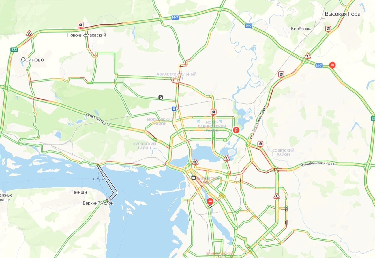 Фото: «Яндекс.Карты»Помимо этого, пробки есть на трассе М-7, улицах Нурихана Фаттаха, Залесная, Тэцевская, Гудованцева, Максимова, Беломорская, Челюскина, Копылова, Декабристов, Воровского, Краснококшайская, Фрунзе, Батыршина, Амирхана и Восход.