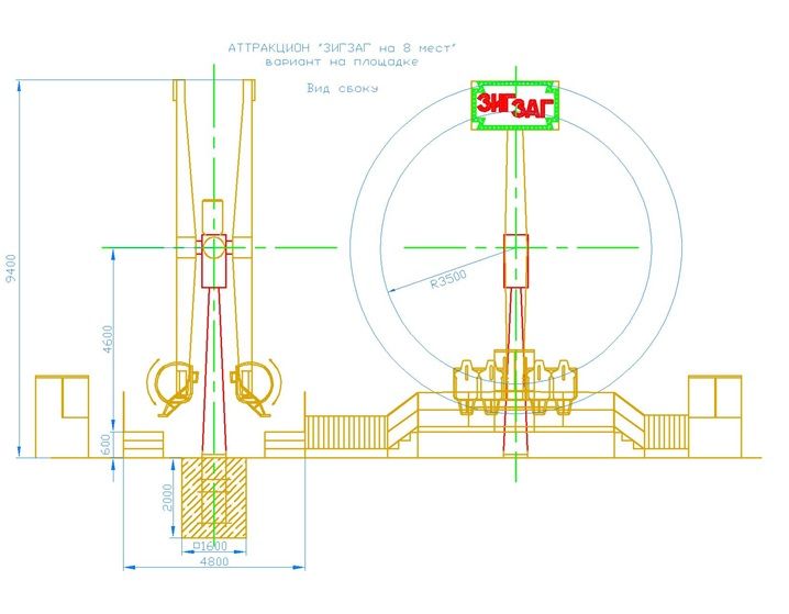Известно, что качели будут вмещать одновременно восемь человек (по четыре с каждой стороны). На основании установлены привод с двумя вращающимися в противоположные стороны балансирами. На балансирах закреплены механизмы вращения с каруселью, на которых установлены сидения.
