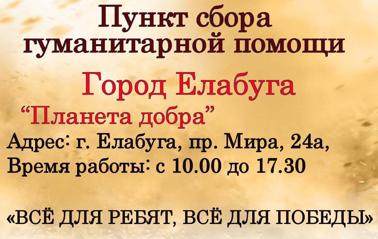 Пункт приёма гуманитарной помощи "Планета Добра" начинает сбор гуманитарной помощи, для бойцов национального батальона “Алга”. От елабужан принимаются различные вещи, продукты питания и бытовые предметы.