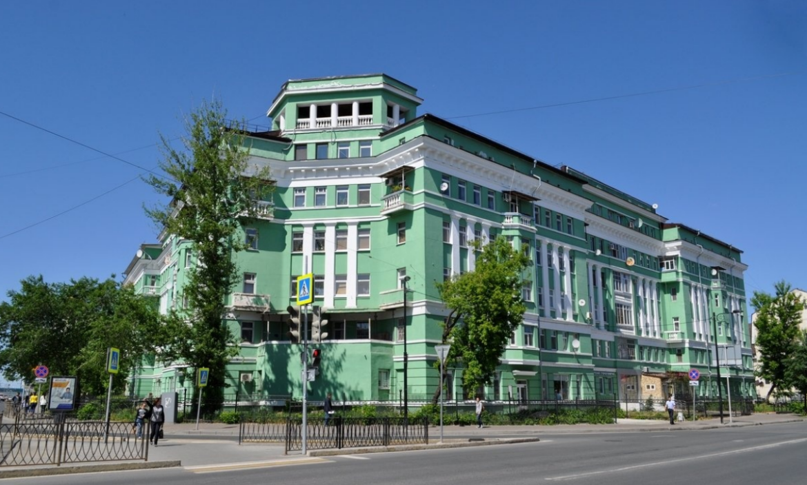 Многоквартирный дом зеленого цвета построили на месте архитектурного комплекса собора Владимирской иконы Божией Матери конца XVII века. Здание задумывали как часть квартала, ограниченного Булаком и нынешними улицами Московской и Чернышевского.
