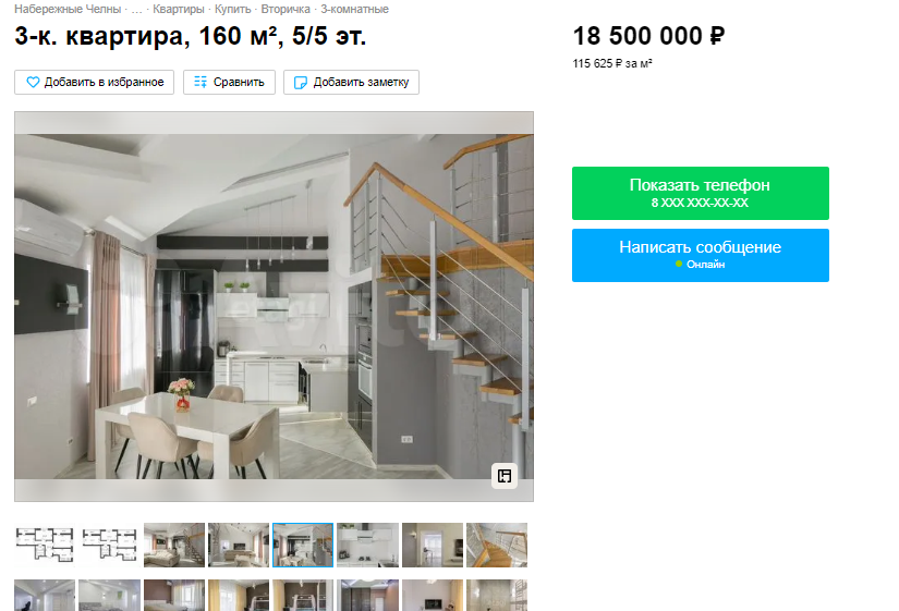 В Набережных Челнах трехкомнатную квартиру продают за 18,5 млн рублей