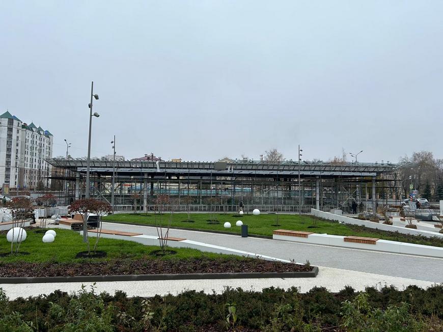 На данный момент строители укладывают брусчатку для стыковки с павильоном. Сам комплекс объединит вход в подземный переход и остановку общественного транспорта, поэтому спуск внутри также обновляется.