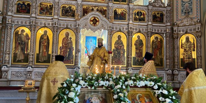 В завершение Литургии было совершено славление празднику, после чего владыка преподал благословение и обратился к верующим с архипастырским словом.