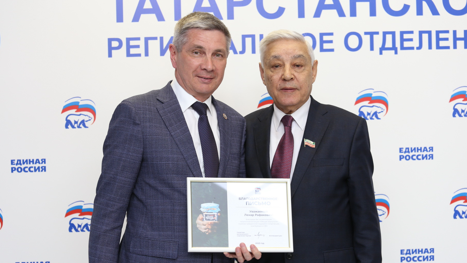 Активное участие в проекте, организованном в поддержку соотечественников, участвовавших в специальной военной операции, приняли актанышцы. Председатель Государственного Совета, Секретарь Татарстанского регионального отделения партии "Единая Россия" Фарид Мухаметшин выразил искреннюю благодарность и вручил Благодарственное письмо Главе муниципального района Ленару Зарипову.