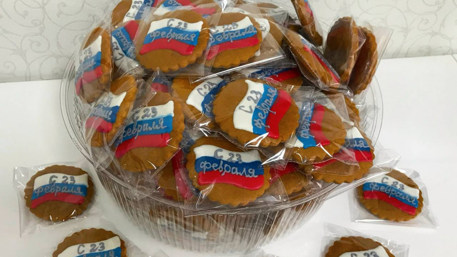 Одна из членов движения Альфина Алякимова приготовила более 120 пряников, украшенных глазурью в виде триколора и надписи «С 23 февраля!», 7 медовых тортов.
