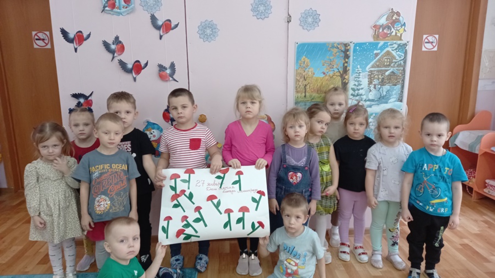 27 января – День снятия блокады Великой города Ленинграда, одна из самых трагических страниц в истории Великой Отечественной войны, народная эпопея, которая потрясает людские сердца и сейчас, спустя 79 лет. Сегодня в детском саду «Малыш» в группах старшего возраста педагоги провели тематические беседы. Дети с замиранием слушали, как жители мужественно обороняли свой город: женщины рыли окопы, дети работали на заводах и фабриках, встав за станки вместо ушедших на фронт братьев и отцов. Ребята услышали о многочисленных подвигах защитников Ленинграда, благодаря которым город выстоял и победил! Дети изготовили коллективную открытку из красных гвоздик, которые олицетворяют мужество, храбрость и победу.