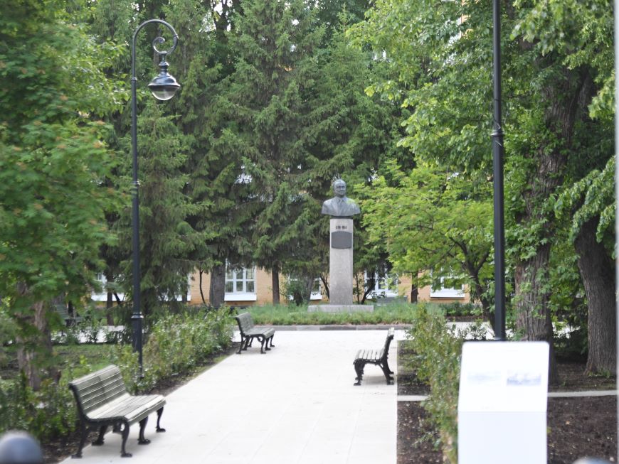 Но этот сквер – не просто площадка, а дань памяти известному ученому Владимиру Котельникову. Основоположнику советской секретной радио- и телефонной связи посвящен бронзовый бюст в конце аллеи, в ходе благоустройства монумент подсветили двумя прожекторами. О достижениях уроженца Казани рассказано на двух информационно-навигационных стендах.